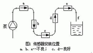水平安裝時(shí)要使電極軸線(xiàn)平行于地平線(xiàn),不要處于垂直于地平線(xiàn),因?yàn)樘幱诘撞康碾姌O易被沉積物覆蓋,頂部電極易被液體中偶存氣泡擦過(guò)遮住電極表面,使輸出信號(hào)波動(dòng)。圖1所示管系中,c、d為適宜位置;a、b 、e為不宜位置,b處可能液體不充滿(mǎn),a、e處易積聚氣體,且e處傳感器后管段短也有可能不充滿(mǎn),排放口*好如f形狀所示。對(duì)于固、液兩相流c處亦是不宜位置。