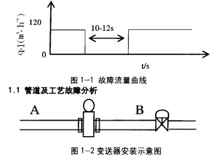 被測液從A流向B(如圖1-2),傳感器水平安裝,電極水平,傳感器下游2m處裝有調節閥,從圖中可以排除由于傳感器中急劇潴留氣和傳感器后無背壓等情況導致的測量脈動情況產生。
