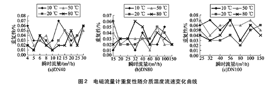 將實驗測得的電磁流量計dn350在不同溫度及流速下的重復性數據整理,特性曲線如圖2所示,3組曲線分別對應DN40,  DN80,  DN100的3塊電磁流量計dn350的重復性曲線。