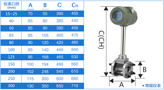 法蘭式渦街流量計:DN15、DN20、DN25、DN32、DN40、DN50、DN65、DN80、DN100、DN125、DN150、DN200、DN250、DN300。
