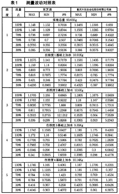 在造紙行業(yè)有大量的紙漿液體需要測量,就會用到大量的流量測量儀表,目前在造紙行業(yè)中用于測量流量的儀表,主要有防腐濃硫酸電磁流量計(jì)等儀表,因?yàn)?strong>防腐濃硫酸電磁流量計(jì)具有非常強(qiáng)的優(yōu)點(diǎn),所以非常適合在紙漿的流量測量中使用。在紙漿實(shí)驗(yàn)裝置上,使用串聯(lián)在同一管道上該公司生產(chǎn)的漿液型防腐濃硫酸電磁流量計(jì)與日本東芝的漿液型防腐濃硫酸電磁流量計(jì)測量不同濃度和流量的紙漿漿液,以驗(yàn)證其可靠性。波動率對比實(shí)驗(yàn)結(jié)果表明,該產(chǎn)品用于紙漿漿液測量時能夠很好地克服漿液噪聲。在滿流量測量時,上述實(shí)驗(yàn)中各濃度下漿液測量穩(wěn)態(tài)波動率均在1%以內(nèi);其它流量下測量時,由于實(shí)驗(yàn)系統(tǒng)主管道上游分流控制流速不穩(wěn),進(jìn)而導(dǎo)致測量穩(wěn)態(tài)波動率相對較大,甚至達(dá)到近7‰ 但由表1可知,在各種漿液濃度及各流量點(diǎn)下,凱銘儀表有限公司生產(chǎn)的漿液型防腐濃硫酸電磁流量計(jì)的穩(wěn)態(tài)波動率始終與日本東芝漿液型防腐濃硫酸電磁流量計(jì)的測量結(jié)果一致,從而表明實(shí)驗(yàn)系統(tǒng)的測量結(jié)果能準(zhǔn)確反映實(shí)際漿液流量大小。 說明:MAX、MIN分別表示該組數(shù)據(jù)測得流速的的*大值和*小值,單位m/s。