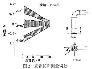 2000年上海原水公司擬在已建成的某泵站加裝DN2200廢水流量計,但彎管下游安裝位置的前直管長度明顯不符合規(guī)定中5D~10D(D為管徑,下同)的要求,此時,影響測量誤差有多大呢?