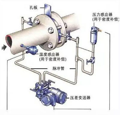 通過引壓管將差壓信號引入差壓變送器,差壓變送器將差壓信號送入流量積算儀,積算儀將差壓信號換算成流量信號。同時通過溫度和壓力傳感器測出蒸汽的溫度和壓力,積算儀根據當時的溫度和壓力計算出補償后的流量。