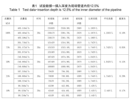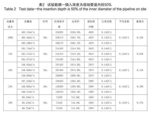 插入式煙氣流量計插入深度為現場管道內徑的50%時,試驗數據如下(以 DN200 為例):
