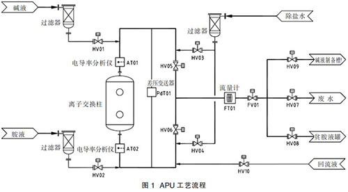 整個 APU 都是通過 PLC 程序自動控制的。程序通過控制閥門的開關使不同的液體按順序進入離子交換柱,使離子交換柱中的液體按順序排出。
