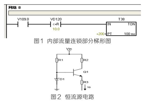 (2)PLC及模塊。PLC及模塊是自動化控制系統主要設備,且PLC及模塊屬于高集成高精密電子設備,保持室內整潔舒適,可以提高自動化系統運行穩定性。PLC及模塊硬件運行可靠,內部控制程序是其控制核心軟件,如PLC硬件出現故障或損壞一般直接更換,但原內部控制軟件無法上傳,整個控制系統成失控狀態。所以其內部控制程序在調試驗收合格后應及時備份并做好標記,為以后修復PLC故障提供保障。PLC系統的維護技術人員需掌握一定基礎PLC控制邏輯原理,對準確判斷PLC故障點有很大的幫助。例如選礦廠水泵房S7-200系列PLC自動抽水系統出現如下故障 :觸摸屏能控制變頻器啟動水泵抽水,但在短時間內會自動停泵,導致無法正常抽水。通過故障現象可初步判斷PLC及模塊硬件設備正常,主要由于某個變量有問題導致連鎖停機。打開備份PLC控制梯形圖程序進行相關分析,原來是高溫液體流量計瞬時流量數值做了連鎖,其在一定時間內瞬時流量不大于10m 3 /h時,自動停泵,電磁流量模擬量輸出電流值僅為4ma且無變化,確定高溫液體流量計有故障。可臨時應急維修,模擬量模塊輸入模擬電流值10ma~20ma之間一固定數值即可恢復正常運行。制作簡單恒流源電路代替高溫液體流量計輸出的模擬電流量,實現解決水泵無法正常運行的故障。