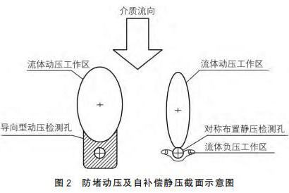 新二氧化氯流量計采用拋物面導向型結構作為動壓測點,采用對稱自補償型式的靜壓測點,可以有效地解決來流方向偏流時信號的穩定采集,來流偏離管道軸線時,可以維持輸出差壓基本不變,如圖2所示。