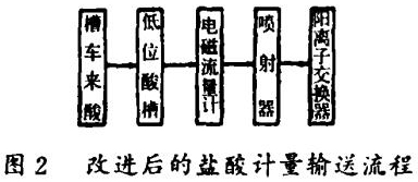 新工藝省去了高位酸槽、酸計量箱和酸霧吸收器,鹽酸計量由管道式流量計控制。該系統(tǒng)是在負壓狀態(tài)下運行,消除了溢酸和鹽酸的揮發(fā),解決了對一些設備和設施的腐蝕,以及酸霧對環(huán)境的污染問題,使用比較安全可靠。