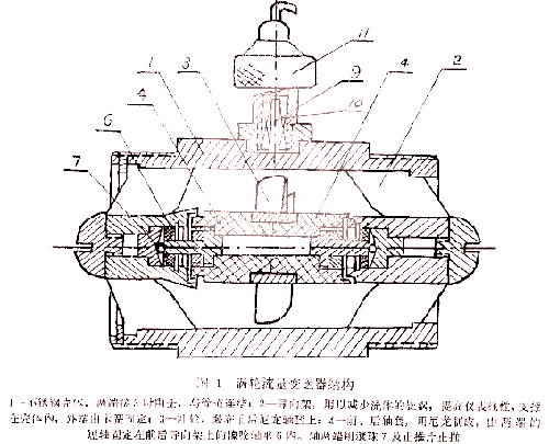 在固井過程使用重油流量計, 主要解決渦輪變送器的耐高壓、耐震以及高速下的耐磨蝕問題。在這方面, 我們采用了耐磨橡膠軸承 , 尼龍軸套, 單滾珠止推等措施, 基本上可以滿足施工要求。結(jié)構(gòu)主要由不銹鋼殼體、導(dǎo)向架、葉輪和前后軸套組成, 見上圖1。