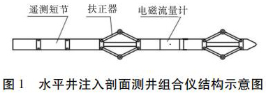 水平井注入剖面測井組合儀是針對水平井籠統注水井注入剖面測井專門研制的,儀器結構如圖 1 所示。井下儀器主要包括通用短節( 遙測、溫度、壓力和 CCL) 、高壓電磁流量計和滾輪式扶正器。測量參數包括流量、溫 度、壓力、自然伽馬和深度。流量計采用的是非集流電磁流量計和集流型電磁流量計,對于注入量較大的井采用非集流電磁流量計,注入量較小的井采用集流型高壓電磁流量計,測量方式采用定點測量。儀器采用遙測技術實現了多參數同時測量和傳輸,儀器外徑 38 mm,耐壓80 MPa,耐溫150 ℃,流量測量范圍為1 ~ 800 m3 /d,測量精度 ± 5% 。