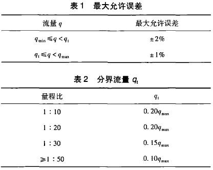在GB21391--2008《用天然氣渦輪流量計(jì)測(cè)量天然氣流量》對(duì)分界流量q,有明確的定義,即低于該流量要采用擴(kuò)展誤差限的流量值。標(biāo)準(zhǔn)*5.2條從*大允許誤差和量程比兩方面對(duì)分界流量做出了規(guī)定,且明確了量程比是在*大允許誤差范圍內(nèi)流量計(jì)的*小流量和*大流量之比。該標(biāo)準(zhǔn)中對(duì)渦輪流量計(jì)要求的*大允許誤差如表1所示,量程比與分界流量q,的關(guān)系如表2所示。