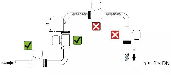 管路必須完全充滿液體。保證管路始終充滿液體至關重要,否則流量顯示會受到影響,而且還會出現(xiàn)測量錯誤。管路結構的設計必須要保證測流管始終充滿流體。當流體有分流或含有固體顆粒沉淀物時,建議使用垂直安裝。但采用垂直安裝時,要遵循流體從下到上的走向,以保證管路充滿流體。