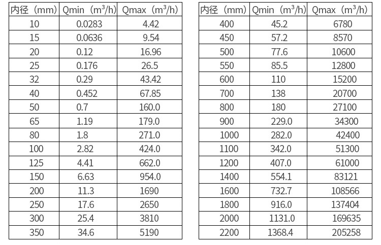 從準確性、經濟性和耐用性方面考慮,推薦使用的流速范圍為1~5m/s (3.3~16 ft/s)之間。在這個范圍內,流量計測量精度高、線性好,動力損耗較小,流體介質對流量計襯里和電極的磨損也較小。