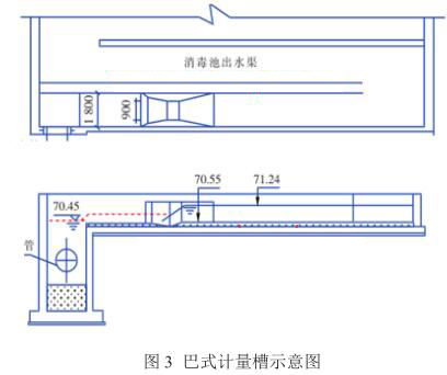 該廠改造后出水經二氧化氯消毒后直接排放,為節省占地,出水明渠與接觸消毒池合建,位于接觸池末端。消毒池出水經堰板跌水后通過2.3米的孔洞180°轉彎流入出水計量明渠。如圖3所示。采用巴式計量槽+超聲波液位計測定流量。